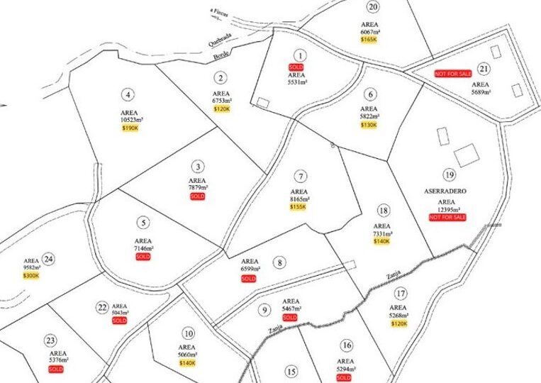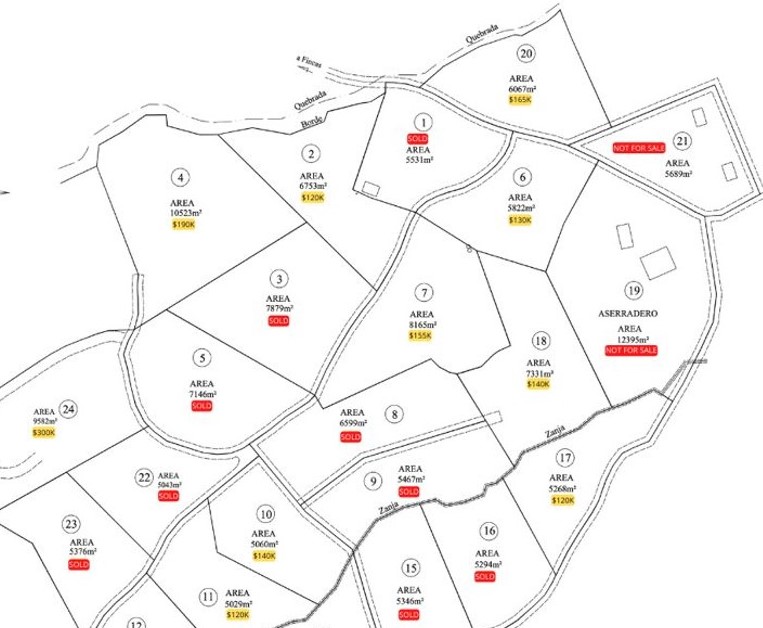 Lot sizes range from 5,000 m² to 11,000 m², with prices starting at $110,000 up to $300,000. All lots include water and electricity.